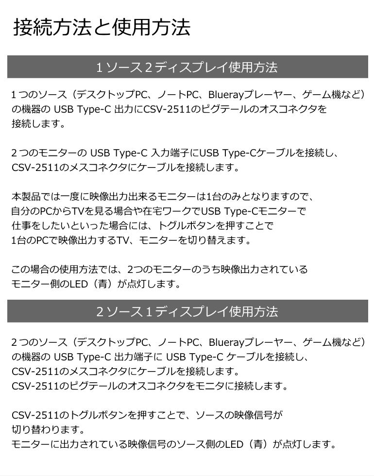 2つのソース(デスクトップPC、ノートPCなど)の機器のUSB Type C出力端子にUSB Type-Cケーブルを接続し、CSV-2511のメスコネクタにケーブルを接続します。CSV-2511のピグテールのオスコネクタをモニタに接続します。