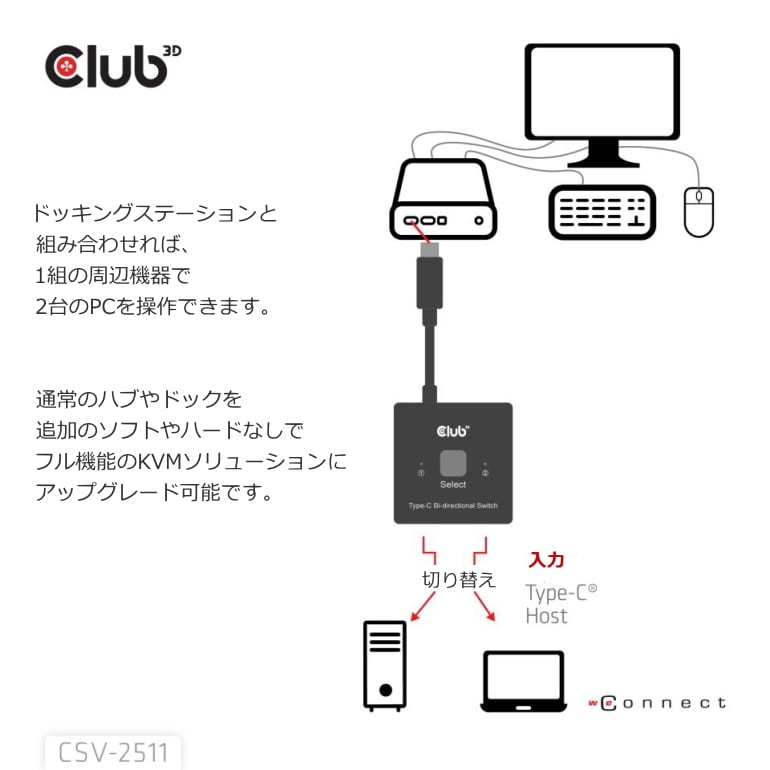 ●Club3D CSV-2551はUSB Type-C 双方向スイッチで、仕事用ノートPCと自宅PC間のモニターをボタン一つで簡単にスイッチできます。既存のドッキングステーションやハブと組み合わせて、キーボード、マウス、モニター1台でフルKVMにアップグレードできます。