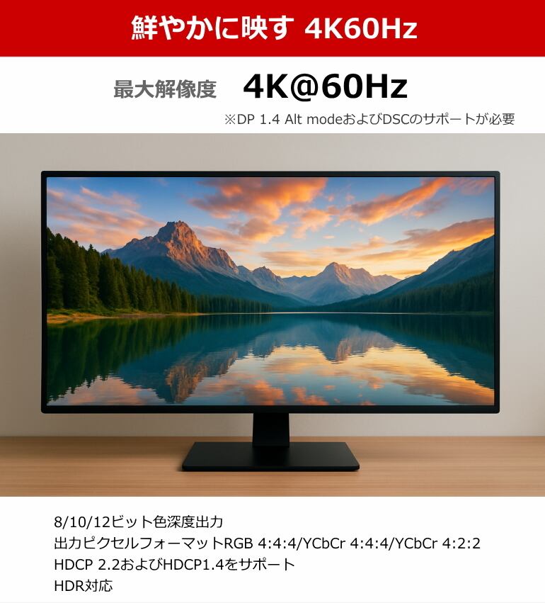 注) DP 1.4 Alt mode サポートのホストを接続する場合は、HDMIの最大解像度は 4k/60Hzです。DP 1.2 Alt mode サポートのホストの場合は、HDMIの最大解像度は 帯域制限により4k/30Hz となります。
