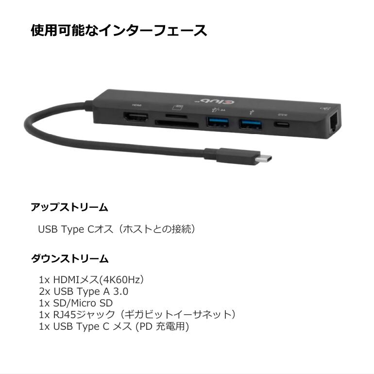・Club 3D USB Type C 7-in-1 ハブ HDMI 4K60Hz / USB C PD 100W / ギガビット イーサネット / 2x USB Type A 5Gbps / SD & MicroSDカードリーダー (CSV-2553)