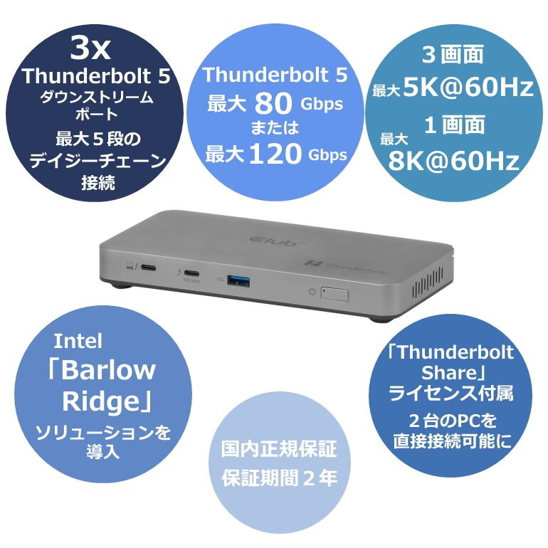 ● 認証取得THUNDERBOLT 5 HUB:Club3D社初のTB5デバイスです。互換性とピークパフォーマンスを保証する完全認証済みです。