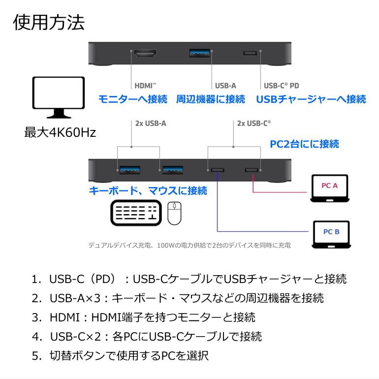 シームレスなKVMスイッチング: 4K/60Hz HDMIディスプレイで1つのキーボード/マウスを使用して2つのタイプCRソースを切り替えます。