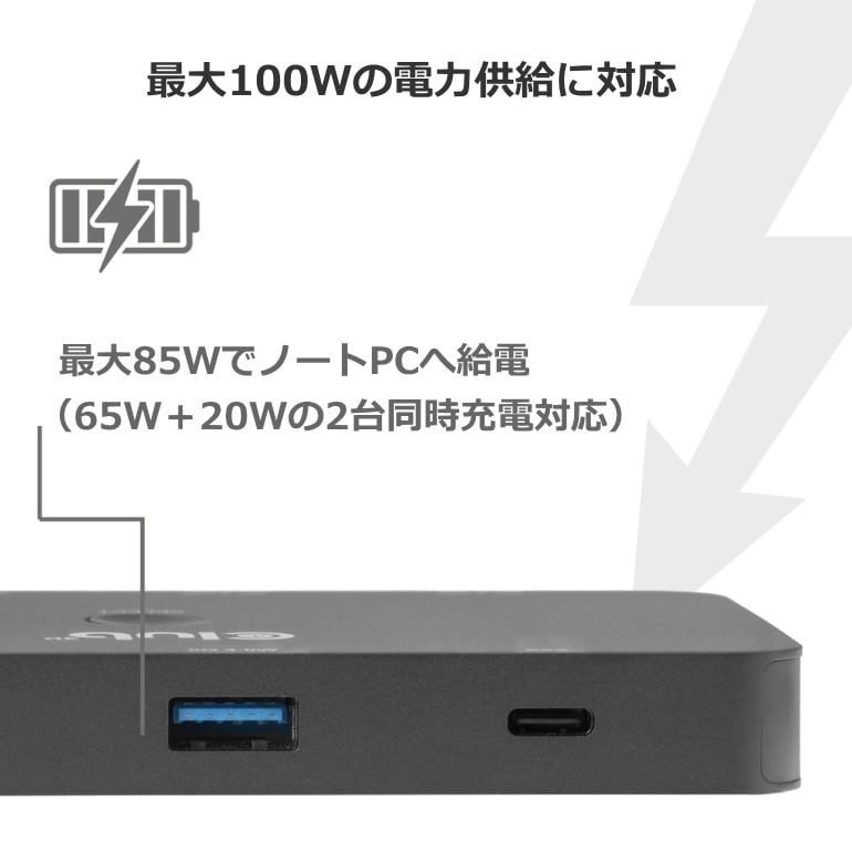 柔軟な電源: ソースから電力を引き出すことでPDアダプターなしで動作、オプションの100W PDを使用して最大85Wのホスト充電を行います。