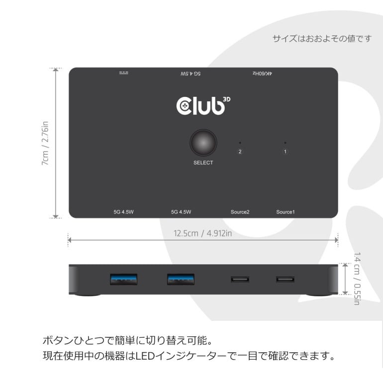 【CSV-2512】Club 3D KVM 切替器 2入力 USB Type-C to HDMI 4K 60Hz (CSV-2512)