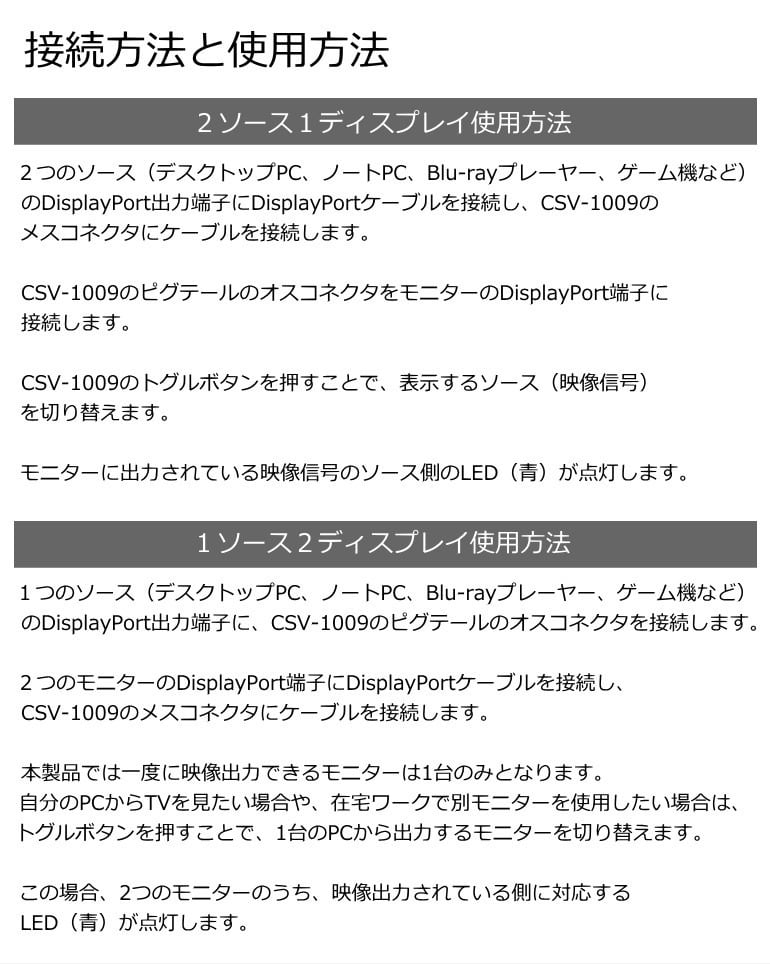 2つのソース(デスクトップPC、ノートPC、Bluerayプレーヤー、ゲーム機など)の機器のDisplayPort出力端子にDisplayPortケーブルを接続し、CSV-1009のメスコネクタにケーブルを接続します。CSV-1009のピグテールのオスコネクタをモニタに接続します。