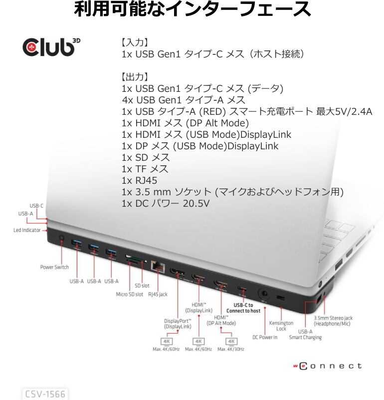 【CSV-1566】Club 3D USB Gen1 Type C トリプルディスプレイ DP Alt mode + Displaylink ダイナミック PD チャージング ドッキングステーション 120W (CSV-1566)